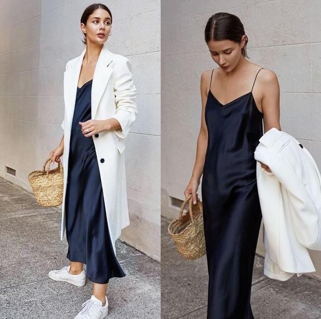 比如宝蓝色的吊带裙搭配西装非常的飘逸,很适合与男生约会的时候穿,女人味儿十足,既优雅又大气,当外套脱下来的时候也不庸俗,恰好展现出了优雅的女人味。