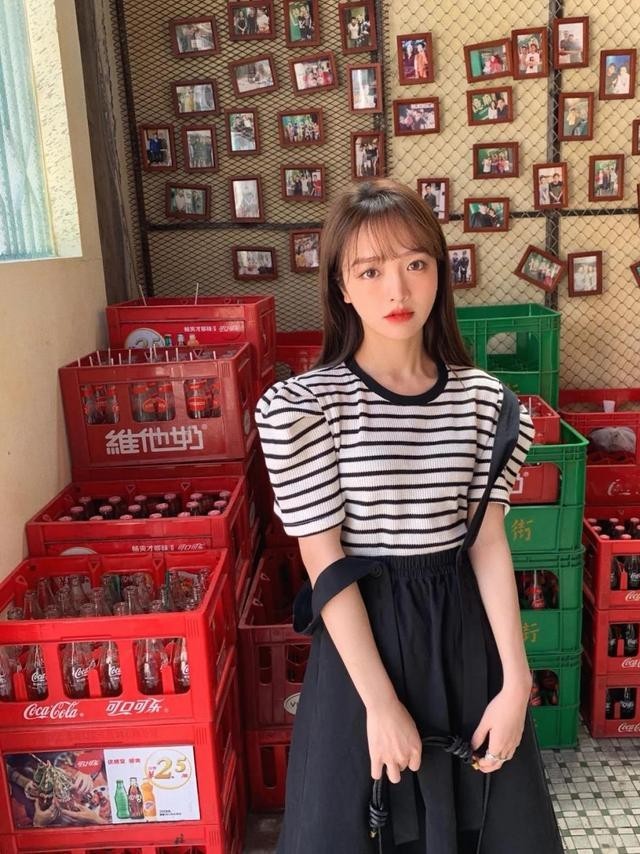用黑白条纹的t恤搭配背带款式的半身裙更加的有立体感,整体的妆容更有港风的气质。很有小女人的气息,女人味十足。