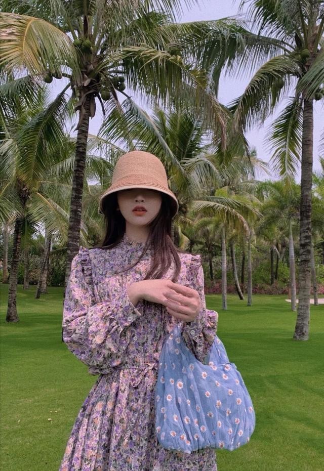 就比如带有印花元素的连衣裙,裙子的印花相对比较简单,在裙子上有很多的设计,用帽子作为点缀,整体的氛围感较强,所背的包包是相同元素的,让整体的造型协调一致。