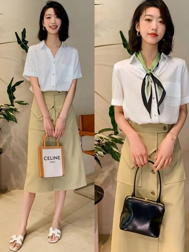 上半身是很有特点的衬衫,下半身则是蓝色带有设计感的半身裙。这种小开叉的设计在夏天非常受欢迎,简洁的同时又有设计感,适合通勤。