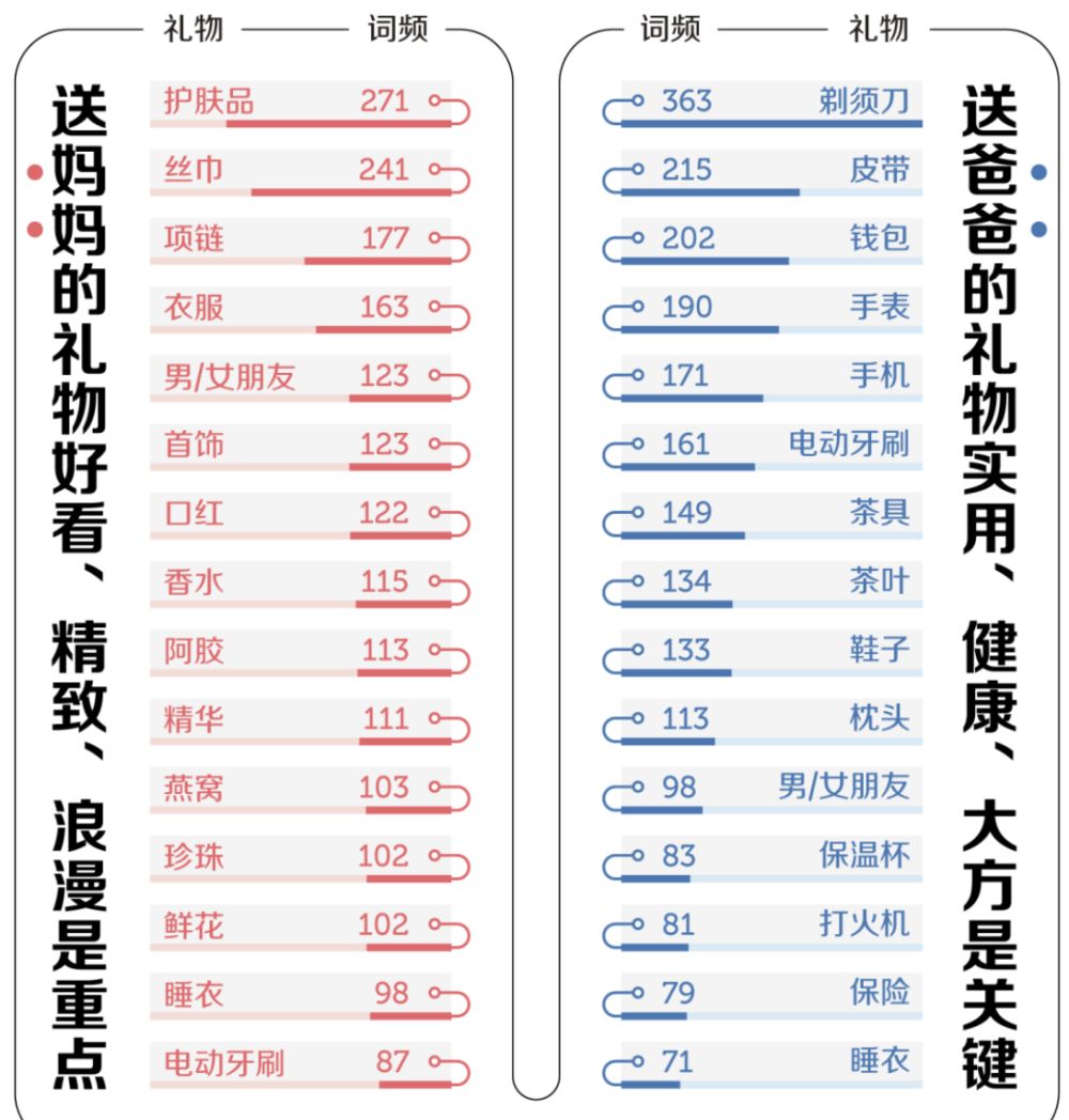 有趣的是,“男/女朋友”同时出现在两份清单中,在爸妈眼中,可能什么礼物都比不上你带个对象回家过年。