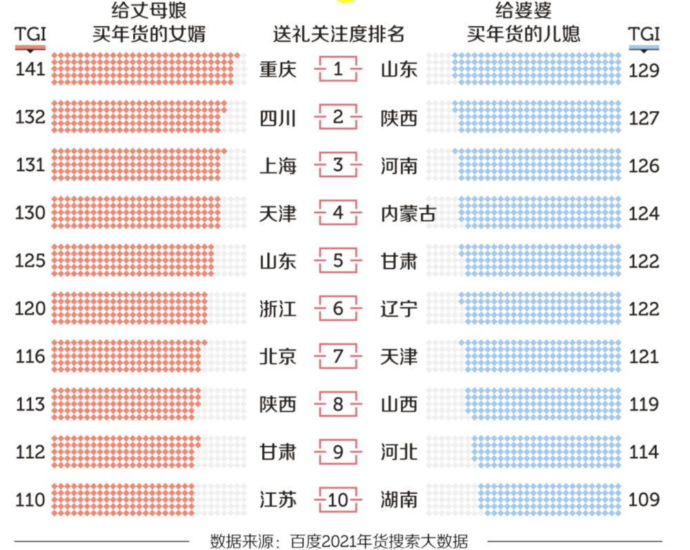 根据百度 2021 年货搜索大数据,四川、重庆与上海女婿的送礼关注度最高,南方省份的“女婿”在春节送礼上下足了功夫。而在儿媳的送礼关注度上,山东、陕西与河南等一众北方省份关注度更高,“北方儿媳”更爱上网为婆婆挑选礼物。