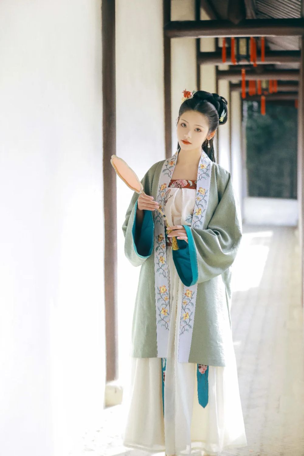 纤细柔美的宋代女子,手间执一把团扇,配上半透纱罗衣服,款款而来,宋韵风雅,不露声色的藏在这一身装扮中。
