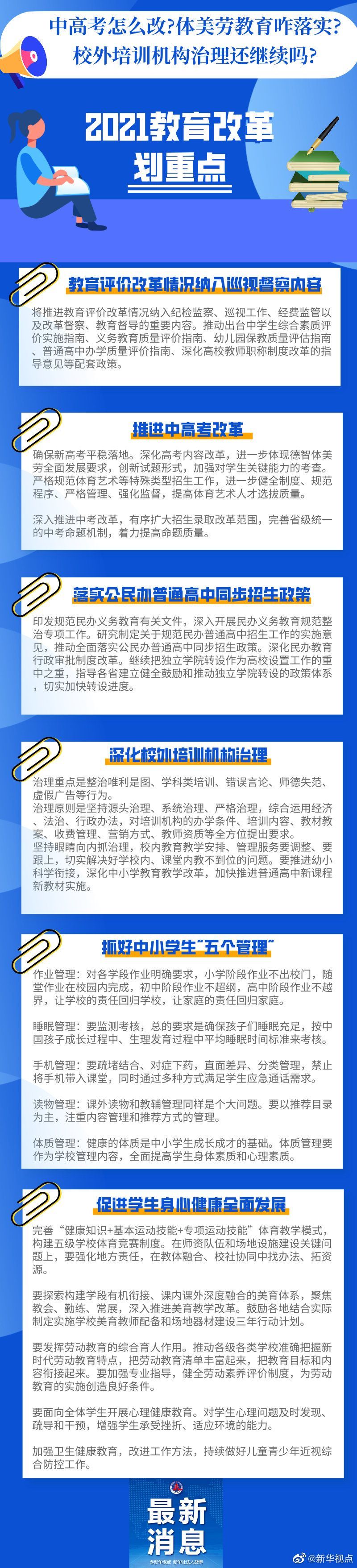 【中高考、体美劳、校外培训……2021年这些都要改革!】中高考怎么改?体美劳教育咋落实?校外培训机构治理还继续吗?中小学生作业、睡眠、手机、读物、体质都要纳入管理?这些社会关心的热点,在#2021年教育发展改革#中都将涉及。记者梳理教育部部长陈宝生在2021年全国教育工作会议上的讲话,及《教育部2021年工作要点》,为你划出以下重点。详情请戳大图↓↓(记者 胡浩)