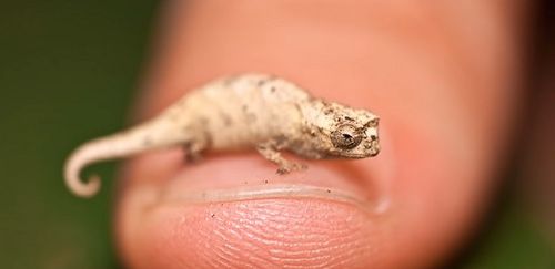 身长23到29毫米的迷你变色龙是世界上最小的爬行动物,生活在马达加斯北部的一个小岛上,它们白天大多待在树叶堆中,晚上则爬在离地4英寸的树枝上休息。迷你变色龙小到可以立在火柴的尖部。