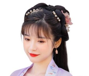 这种发型对于额头较高的女生太适合不过了,跟公主头盘发有着异曲同工之处,把头发盘起来,剩余的头发披散下来,眼前的刘海垂下眼帘,看上去尽显温柔,在穿上汉服尽显淑女范!