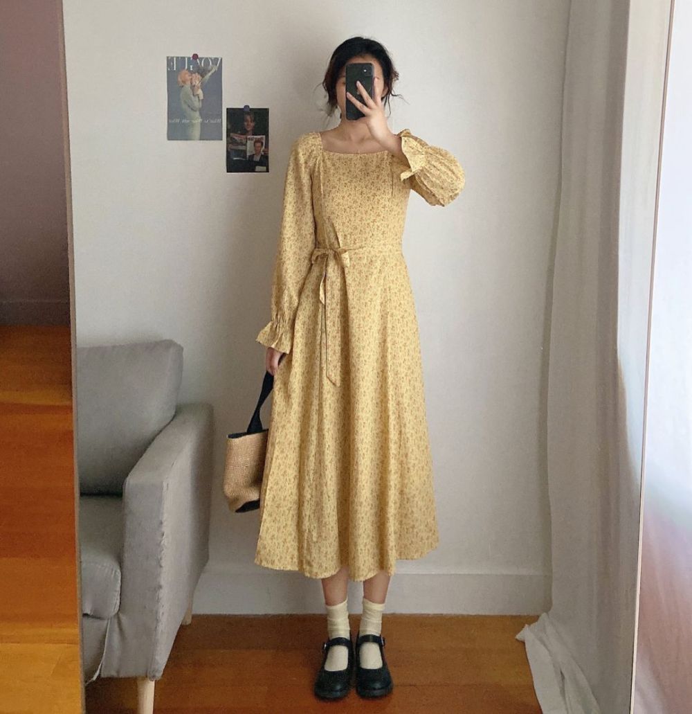 黄色碎花连衣裙 超级复古的一款 翻领设计很显锁骨 花色复古有感觉 很特别 显白清新😄